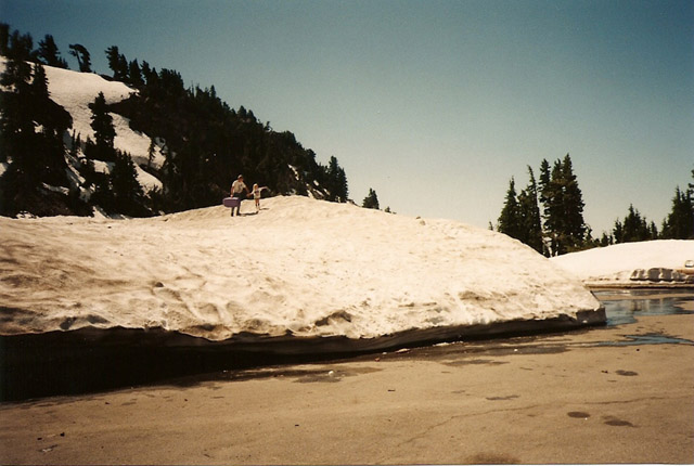 Pictures (from left to right): (1)Trailhead for Lassen Peak August 1998; the parking lot still had a lot of snow from a heavy winter snow pack and Carl and Michelle went sledding on the snow. (2)Danielle and Michelle on a rock at Hope Valley Campground in the Sierra Nevada Mountains, CA, August 1998