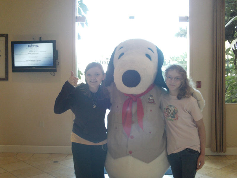 Jodie in Casket at Knotts Berry FarmMichelle and Danielle with Snoopy at Knotts Berry Farm Hotel